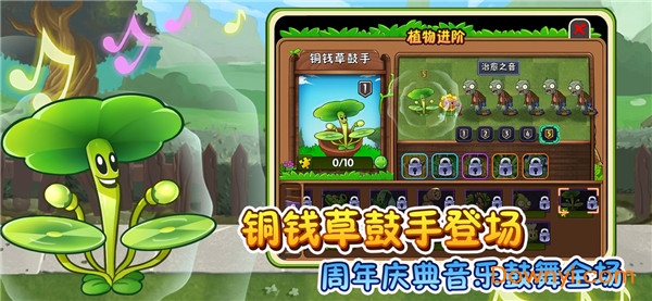 灯光!奏乐!鼓声!舞台的幕布已经拉开,七周年庆典专属植物铜钱草鼓手登场啦!铜钱草鼓手可以击鼓发出音波,美妙的乐音不仅会对附近的植物造成激励效果,带来攻击力和攻速的全方面加持,还能吸引僵尸驻足,造成减速效果。如果周围有音乐植物的伙伴们,它们的合奏将会更加精彩,敬请期待他的精彩表现吧!