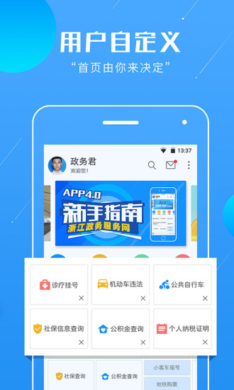 浙江政务服务app4.0全面践行用户中心理念,用户可以按照个人习惯和需求定制个人首页的同时,也会及时收到所有办事动态提醒等个性化服务,率先在全国实现“这是我的政务服务网”理念。