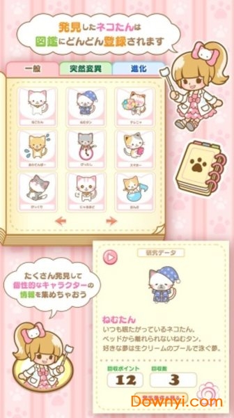 猫猫研究所安卓版游戏中,粉粉嫩嫩的游戏画面让人少女心萌动,可爱乖巧的猫咪数不胜数,在这里可以收集养成合成各种猫咪,让喜欢猫咪的玩家得到最大的满足,关于猫咪的研究游戏做到了极致,还不开始行动起来吗