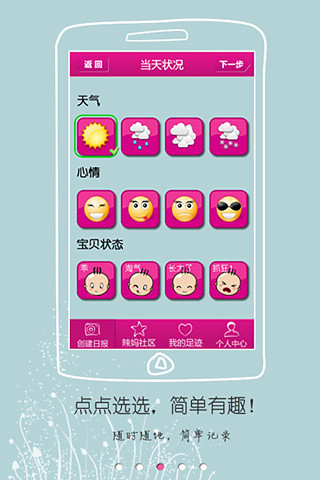 3.用户在使用时通过创建当天日报选择一些如:天气、当时心情、宝宝状态等基本元素,然后上传照片选择自己喜欢并合适于照片的模板,以选择或者编写的方式记录当日的一些情况,即可生成一张个性化的日报并实现自分享及自运营功能。