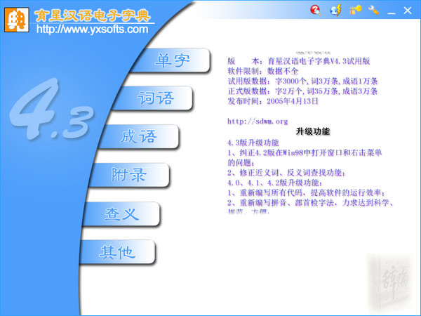 育星汉语电子字典具有拼音、部首查询功能,数据参照最新版的新华字典,方法同新华字典的拼音、部首查字法,且比手动翻字典更方便、更迅速。本电子字典支持模糊查询,可根据词语、成语中的部分字词进行模糊查询。本电子字典支持全文检索,即根据词义的部分解释查找相关的词语。