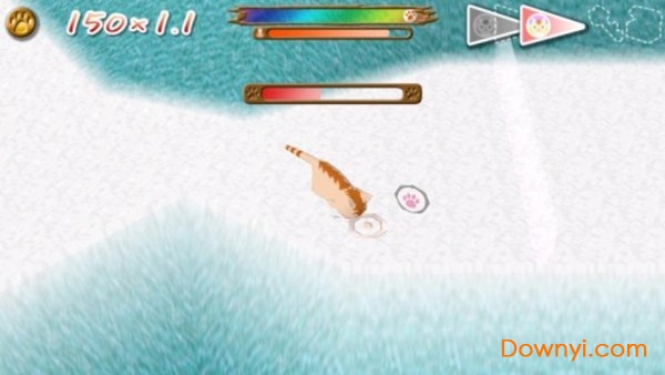 有时候在路上会遇到猫饲料,可以让猫咪走过去吃。有看到画面左上方出现的蓝光吗?那是一串蓝海,蓝海来临就要快点往前喔!不然被蓝海碰到的话游戏就要重头开始了。