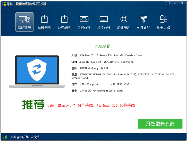 屌丝一键重装系统是一款功能非常强大的系统重装软件,屌丝一键重装系统拥有“云”模式,安全补丁更新到最新、海量驱动,全面兼容新旧配置、安全又高效,稳定可靠等功能。拥有屌丝一键重装系统,无论新手老手都能够轻易上手。