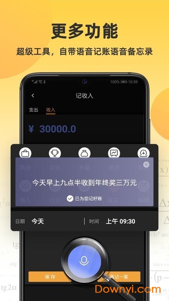 【语音记账】支持语音输入识别功能,自动识别收支分类和时间,并且生成记账条目。支持连续记账,清晰分类收支;