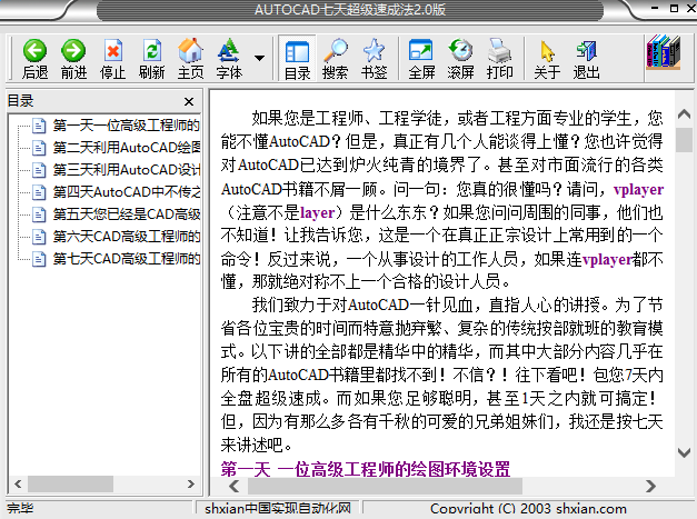 autocad七天超级速成法是一款很好用的AutoCAD学习软件,通过这个软件可以让大家一个星期内掌握AutoCAD的基本知识,各种实例详细讲解,每天都十分充实,有需要的朋友就快来下载试用吧。