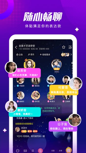 海量在线优质用户,多人语音房,你专属的线上派对,用声音魅力展示自己,找出属于你的声音,与高颜值主播在线组CP。