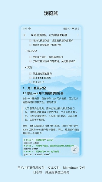 2、对各个格式的文件做了兼容处理,你可以直接打开.java、.js、.css、.cpp等文件,并且可以提供语法高亮展示,手机直接看代码。