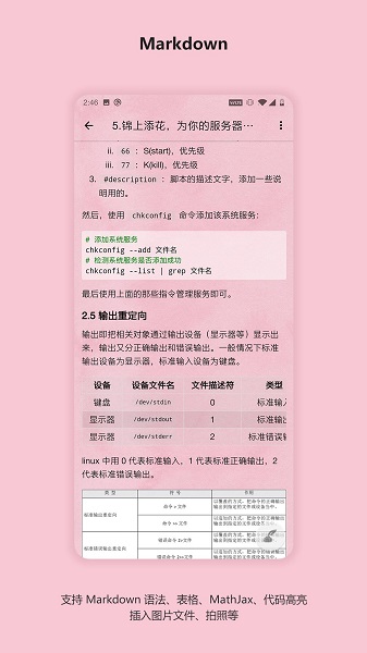 4、丰富的语法:丰富的 markdown 语法、各种计算机语言语法高亮、mathjax 语法等;