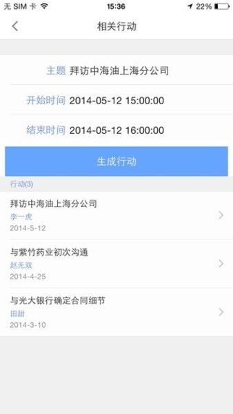 10.日程,可查看、新增、编辑、删除行动日程,日程可共享给他人,可根据行动日程生成行动。