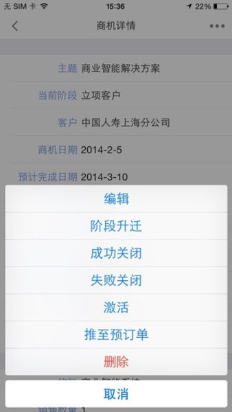 2.商机,可查看、新增、编辑、删除商机,可对商机进行阶段升迁、成功关闭、失败关闭、激活,可查看及编辑商机的相关对象。