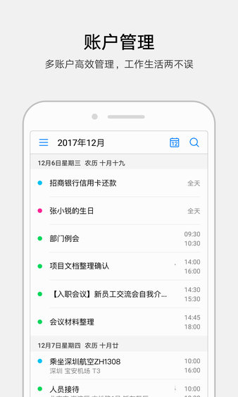2、日程信息:支持登录多个账户,进行日程同步,可以设置重复类型、账户、提醒时间。重点信息一目了然,更好的管理您的日程。