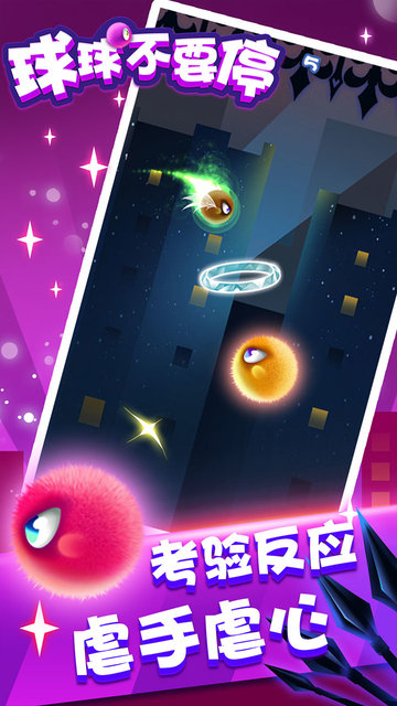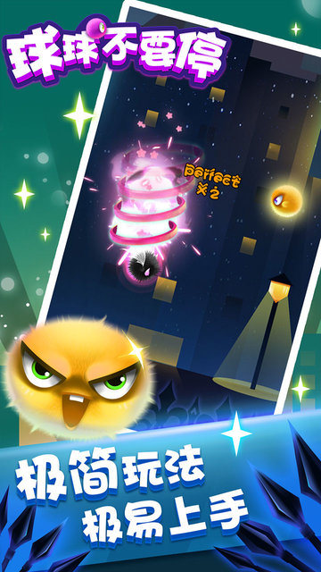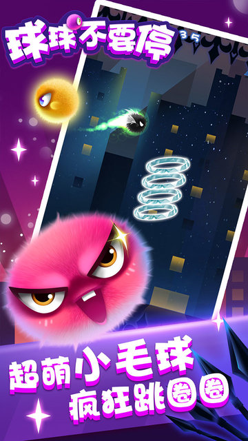 《球球不要停》是款超休闲q萌游戏。q萌的小毛球要在暗黑城市展开一场求生冒险了!炫彩的皮肤,华丽的特效,优雅的拖尾,快来解锁不同的皮肤,感受不一样的视觉盛宴吧!最简单,最具挑战性的跳圈圈跑酷玩法,让人心跳加速,根本停不下来!是高手就来挑战!~