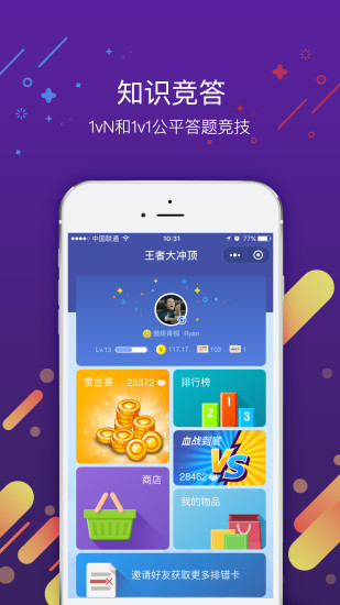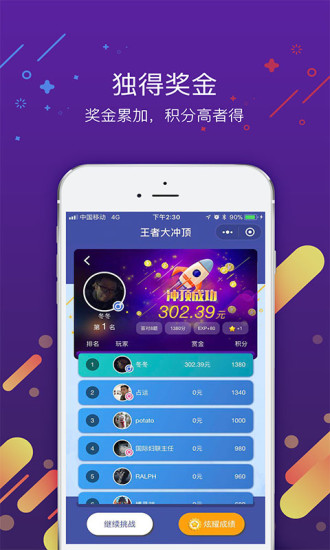 2.“赏金赛”1人vs多人,15个段位,冲顶知识王者,击败众多对手获得丰厚奖金。