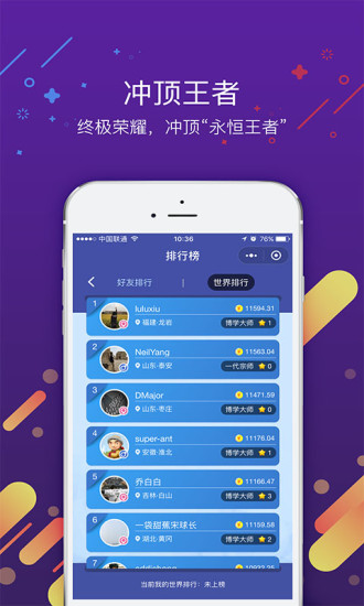 王者大冲顶app是款线上参与答题就能赚钱的手机客户端应用软件,不用每天定时等待,这款软件能二十四小时答题,随点随开,得分最高的人就能获得所有的奖金,赶快来下载试用吧!!!