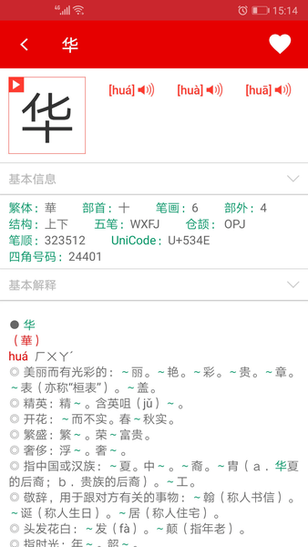 一款功能丰富、实用性强、适用范围广泛的大型字典类APP,适合中国本土居民及海外华人学习使用,由于大量加入了英语注释,故对懂英语的外籍人士也能很好适用。字典共收录超过2万汉字,容纳了现代汉语通用字、常用字,也收录了一些文言用字、生僻字,对于一些极为生僻几乎无使用的字作出了适当删减。
