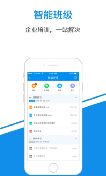 智能上传资料、推送通知、流程管理、组织学员学习
