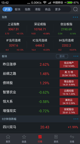 2.指数板块:提供沪深两市各类指数的实时行情,为投资者提供揭示最直观的市场情况。