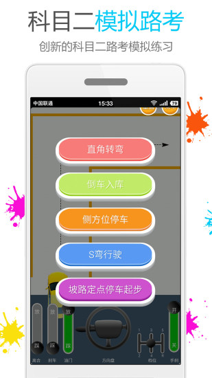 【模拟驾驶】考驾照具有模拟路考模拟驾驶新功能,包括:直角转弯、倒车入库、侧方位停车、S弯行驶、坡路顶点停车起步。