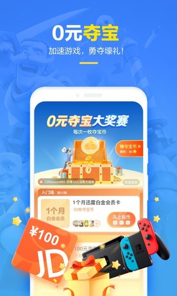为游戏加速,还可免费领取夺宝币,迅雷白金会员卡、京东e卡、 switch每天限时狂送!等你来拿!