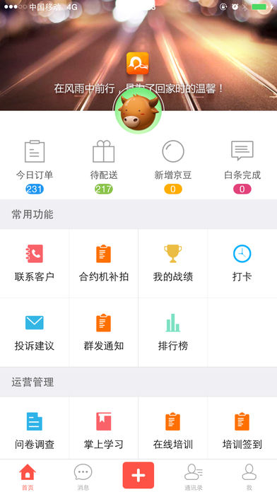 京牛软件不仅实现了平台与配送员之间高效的管理与互动,也让企业与一线员工的沟通变得更顺畅.京牛针对配送员的基础需求,提供了诸多实用功能,包括联系客户、通讯录、我的战绩、消息通知等等,京东配送员打造的一款专属办公app。京牛作为京东配送员专属的移动办公软件,配送员在手机上使用ERP账号登录,可以方便的完成日常移动办公和个人业务数据查询分享等功能。