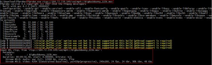 5.查看rtsp视频流信息:则执行以下命令,结果图所示:有两个流,一个视频流,一个音频流,视频流采用的是h264(即对应枚举类型avcodecid中的av_codec_id_h264)编码方式,音频流采用的是aac(即对应枚举类型avcodecid中的av_codec_id_aac)编码格式;此文件播放时长为9分56.48秒;帧率为24;视频帧的像素格式为yuv420p(对应枚举类型avpixelformat中的av_pix_fmt_yuv420p);视频尺寸为240x160