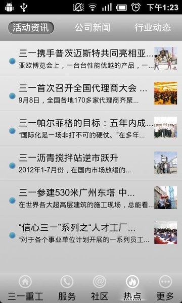 三一集团有限公司始创于1989年。二十年来,三一集团秉持“创建一流企业,造就一流人才,做出一流贡献”的企业宗旨,打造了业内知名的“三一”品牌。三一重工主要从事工程机械的研发、制造、销售,是中国*、全球第六的工程机械制造商。三一重工产品包括混凝土机械、挖掘机、汽车起重机、履带起重机、桩工机械、筑路机械,主导产品有混凝土输送泵、混凝土输送泵车、混凝土搅拌站、沥青搅拌站、履带起重机、汽车起重机、旋挖钻机、压路机、摊铺机、平地机等。三一重工移动app,是以三一集团的风格、品牌、服务、分享为一体的移动终端应用。里面包含了三一重工机械产品、经营范围等;你可以通过电话直接联系到TA;也可以通过导航迅速找到三一重工的具体位置;你还可以通过微博把你的开心分享给你的好友,还有很多可以…… 三一重工是中国*,全球第六的工程机械制造商。三一移动APP,一切为了顾客,一切源于创新,用品质改变世界。