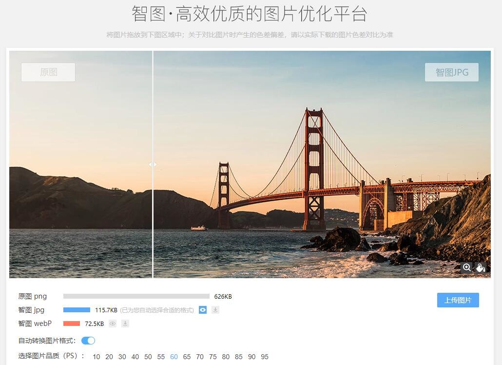 能够自动为您选择压缩率压缩并且在合适的情况下为您选择正确的图片格式。与此同时,智图也会为您上传的图片转换一份webp格式的图片。