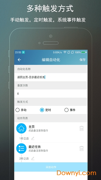 用户可以设置定时时间执行自动化,如:早上八点钉钉打卡,中午12点设置静音,晚上九点打卡飞行模式等等。