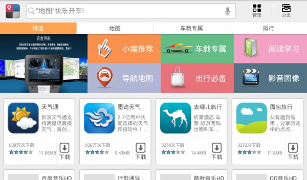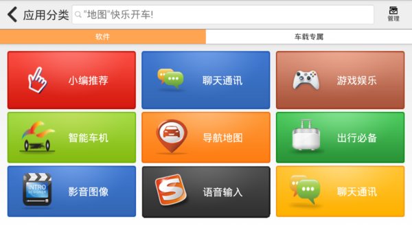 分类:将适合车机使用的应用按照地图导航、电台、音乐、车生活、系统工具等类别进行分类,让您一目了然找到目标应用。