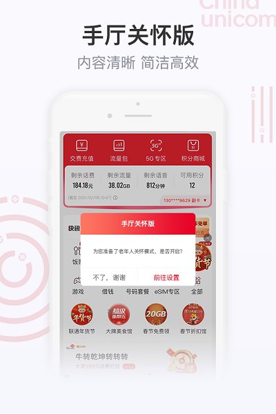 联通手机营业厅app关怀版可在设置内开启关怀版模式,精选功能进行展示、大字体、大图标、高对比度,关怀老高龄用户群体,创享有温度的智慧生活!