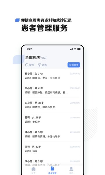 【患者管理】医生可以对在线复诊、线下报到的患者进行备注分组和诊后跟踪病情;