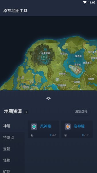 这里直接打开地图,体验过3测的原神玩家,肯定都知道地图中的这两个资源十分重要,一个风神瞳一个是岩神瞳,获取它们可以增加永久体力上限,让你可以爬的更高,跑的更远。但是在游戏内这资源却不太好收集,有的藏的很隐蔽有些需要技巧才能找到,这个时候就可以使用地图工具了,在左侧点击对应的资源,就可以显示在右侧的地图上了。