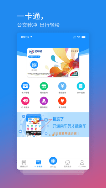 交运通app定位为移动出行服务平台,为用户提供出行查询服务、车辆班次、地理位置、路况信息、旅游出行、汽车租赁、包车、o2o生活、电子优惠券推送、会员优惠制度等服务。为重庆20多个区县千万用户提供公交ic卡在线办理、在线年检、在线充值、消费查询以及电子公交卡“乘车二维码”服务,通过手机二维码即可便捷刷卡消费,乘坐公交、出租、客轮以及汽车票支付。