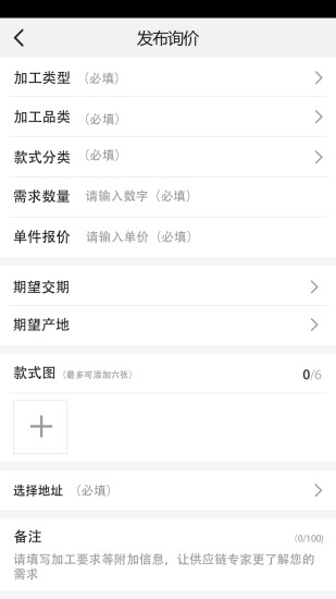 流程:打开app→注册登录app→首页选择加工类型→选择工厂,点击右下角下单→下单页面填写加工信息及要求→点击右上角提交。