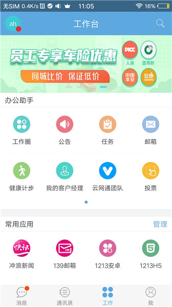 为政企客户量身打造,可提供融合通信和移动办公一体化企业内部交流工作。以企业通讯录、im、工作圈为基础,公告发布、任务管理、电话会议、考勤、薪酬等办公轻应用,支持行业应用和企业个性化应用自主接入,满足企业移动办公的数据安全性、反应及时性等需求,帮助企业降低沟通成本,提升工作效率。