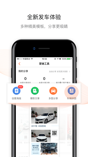 销售人员随时随地进行车辆管理(包括车辆录入、信息变更、状态变更、上架微店等)、客户管理(包括新建客户、回访任务设定、客户跟进等)。