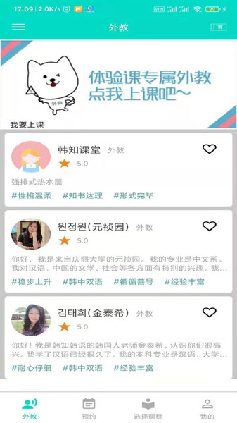 1. 师资:心仪外教自己选,韩知线下课堂好评率高的外教才可以成为线上外教!韩中双语适应中国学生,韩语教学资格认证、韩知统一培训。