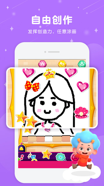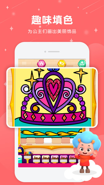除了普通的彩笔绘画模式,还有填充模式,帮助你一件填充背景颜色,以及一些可爱的小贴纸,发挥你的创造力,为公主戴上饰品吧。