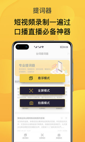 口播提词神器app,短视频录制提词软件,打开悬浮窗,轻松提词,支持文案智能录入、全屏提词、文字大小/颜色调节等功能,让短视频录制更轻松。