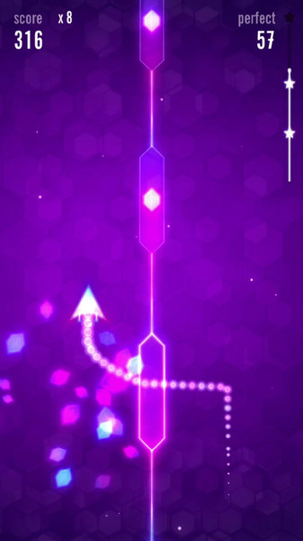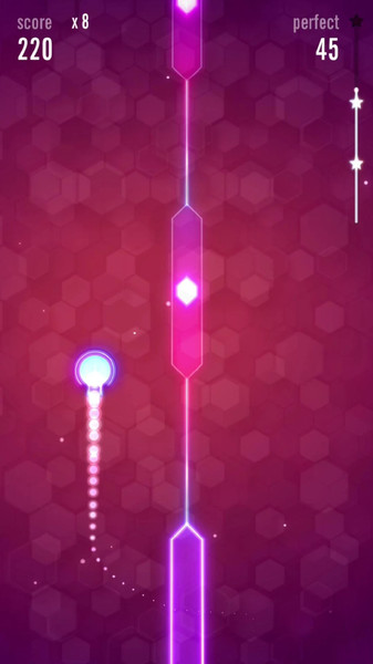 2、适合不同年龄段的玩家,只需要一根手指就能轻松的控制,点击屏幕让飞船穿过节拍正中间,得到分数;