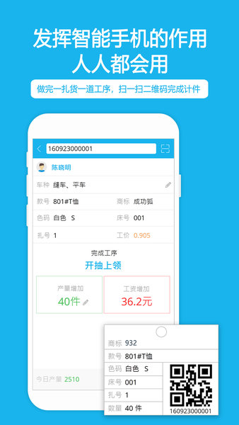 932扫码计件软件:适用于服装工厂。1扎货绑1张二维码,员工做完一扎货一道工序,扫一扫二维码完成计件。数据和erp生产管理软件实时对接,产量统计、工资计算等。员工在手机上可查看自己每天每月的产量、工资。