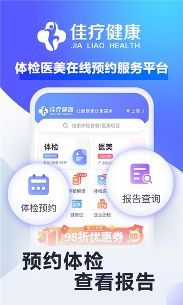 佳疗健康体检报告查询是一款可以提供体检预约服务的软件,可以智能推荐附近体检设施,在线购买套餐更加方便,在手机上就可以直接预约,还可以自由选择体检项目,快来试试吧!