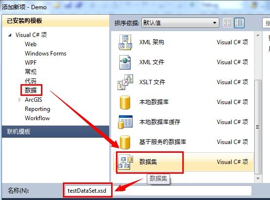 (1)在”解决方案资源管理器“的本项目”demo“上右键,-->添加-->新建项...。在”已安装的模板“(左侧)选择”数据“,在对应的右侧栏中选”数据集“,并为其命名为”testdataset.xsd“。