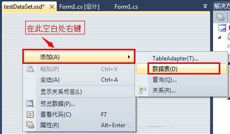 (2)在自动显示的testdataset.xsd窗口空白处右键,-->添加-->数据表。