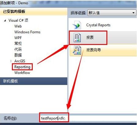 (1)同添加数据集相似。在项目名称上右键,-->添加-->新建项...。”已安装模板“中选择”reporting“,相应右侧选择”报表“,在下面名称中改为”testreport.rdlc“。