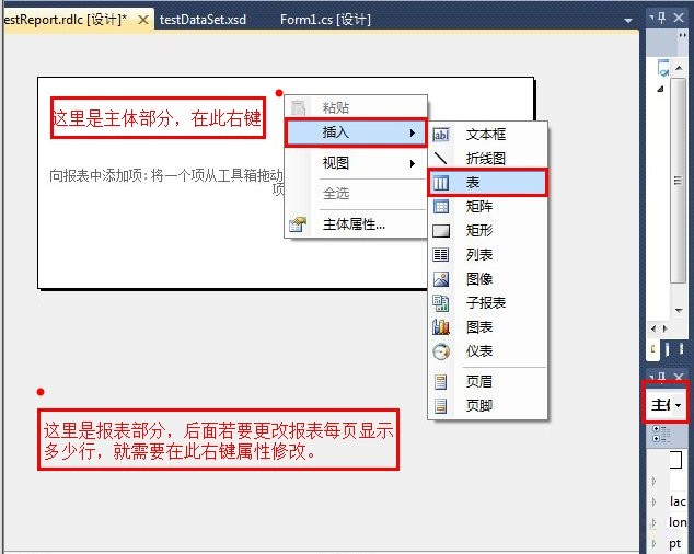 (2)在新视图的主体部分(黑色方框内部为主体部分,外部为报表部分)空白处右键,-->插入-->表