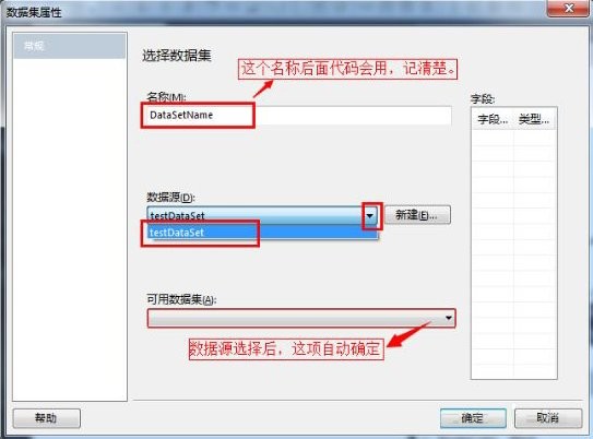(3)会自动弹出”数据集属性“对话框,将”名称“改为”datasetname"(这个名称很重要,后面代码中要用到,故要记清),“数据源”选择刚新建的“testdataset",”可用数据集“会自动选择”testdatatable“,"确定”。