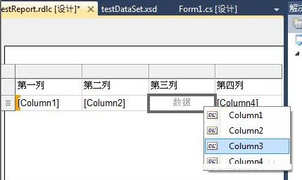 (4)在testreport.rdlc[设计]视图下,刚建的“表”只有三列,在任一单元格上右键,-->插入列-->靠右。在第一行的”表头“输入这三列的表头,在第二行的”数据“行,鼠标移动每个单元格上,点击单元格右上角的图标,选择相应的列。