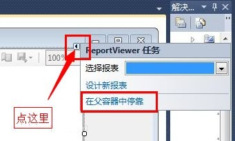 (2)切换至设计窗口,选择reportvierwer控件右上角黑色小三角,显示“reportviewer任务”,选择”在父容器中停靠“