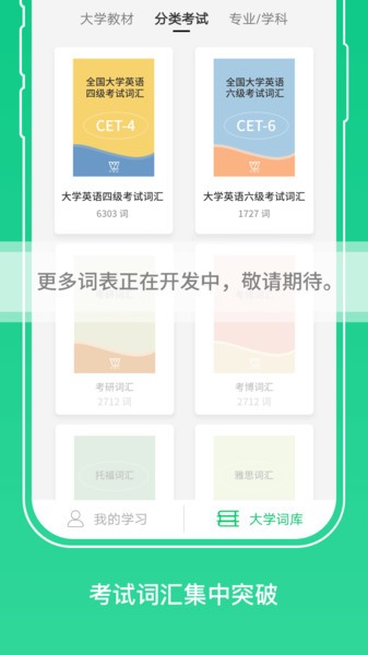 外教社词博士是大学生学习英语单词必备的软件,帮助大学生克服学习单词难记难背单词掌握不牢等困难,从教材,考试等方面的单词抓起,逐步记住并融合贯通。